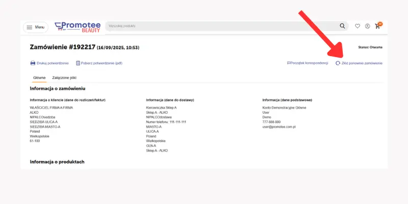 W szczegółach zamówienia znajdziesz ikonę okrągłej strzałki. Kliknij w nią, aby system dodał całe zamówienie ponownie do koszyka.
