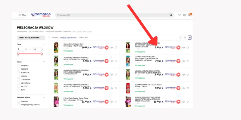 Na stronie głównej lub w katalogu, zanim otworzysz kartę produktu, przy każdym produkcie widoczna jest cena minimalna – to najniższa cena spośród wszystkich dostawców oferujących ten produkt.