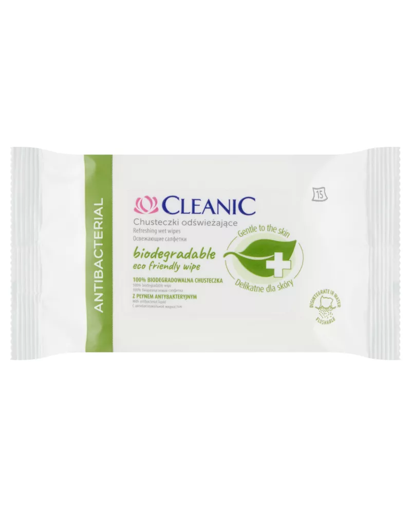 Nawilżane chusteczki odświeżające Cleanic Antibacterial Biodegradable Eco Friendly Wipe z płynem antybakteryjnym. Skutecznie oczyszczają ręce i ciało. Testowane dermatologicznie. pH neutralne dla skóry. Biodegradowalna chusteczka.